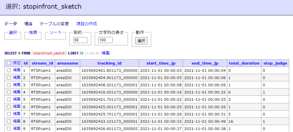write.writerow([record['stream_id'],areaname,tracking_id,record['start_time_jp'],record['end_time_jp'],record['duration'],record['stop_judge']])
